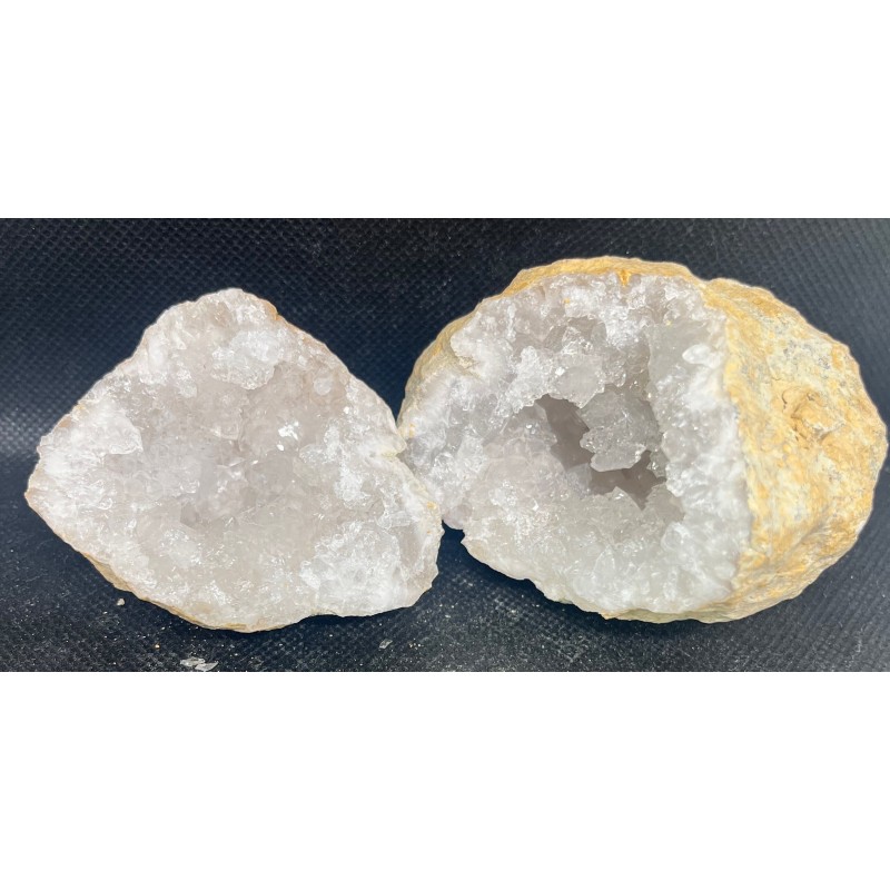 En ouvrant cette roche minérale, vous découvrirez un intérieur tapissé de cristaux blancs étincelants, réputés pour leur énergie pure et leur capacité à amplifier les vibrations environnantes.